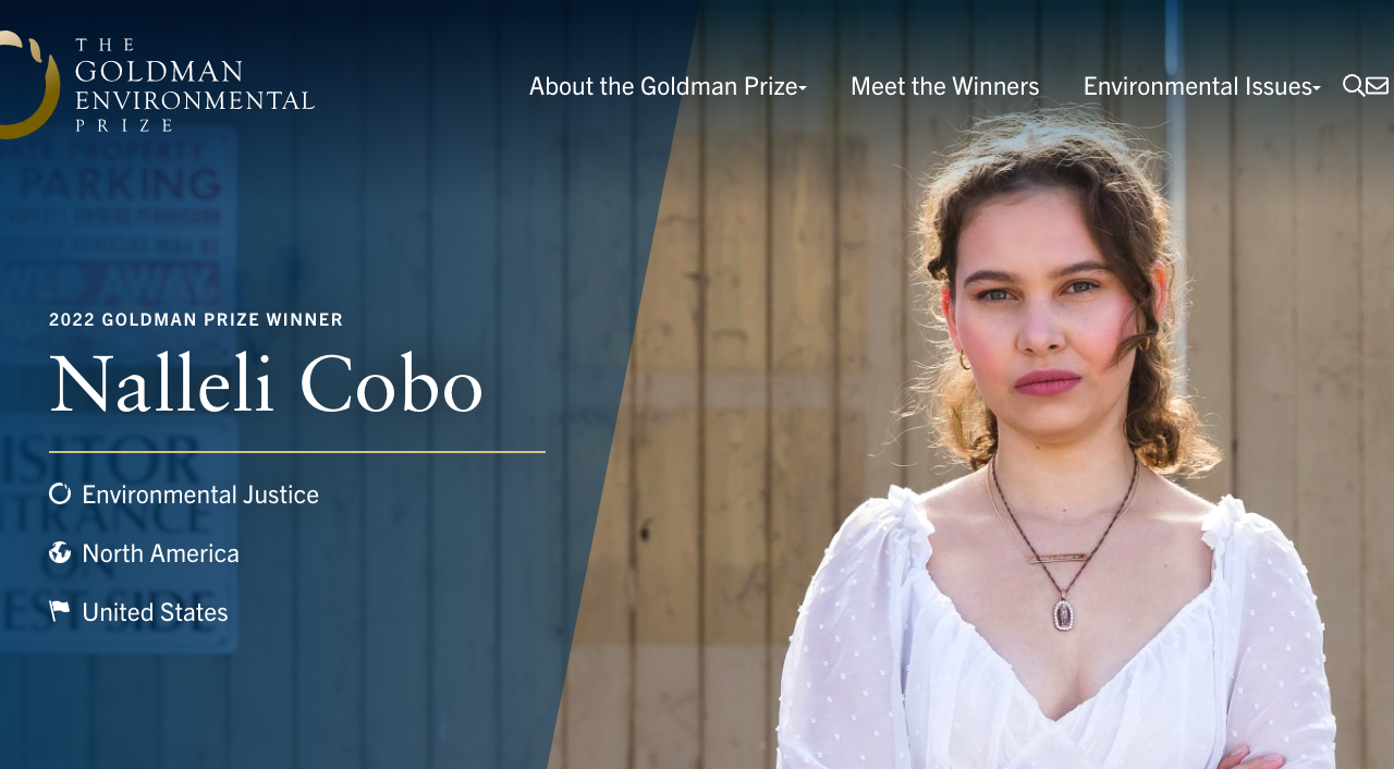 Nalleli Cobo es una joven activista de raíces latinas reconocida con el prestigioso premio ambiental Goldmanmérito del que se ha hecho merecedora por su trabajo contra los sectores de perforación petrolera en Los Ángeles Estados Unidos.